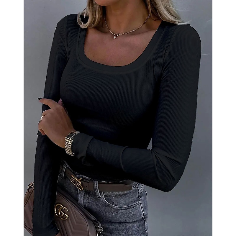 Women's T Shirt Solid Color Plain Basic Long Sleeve U Neck Regular Tops Daily Black White Pink Spring &  Fall 7