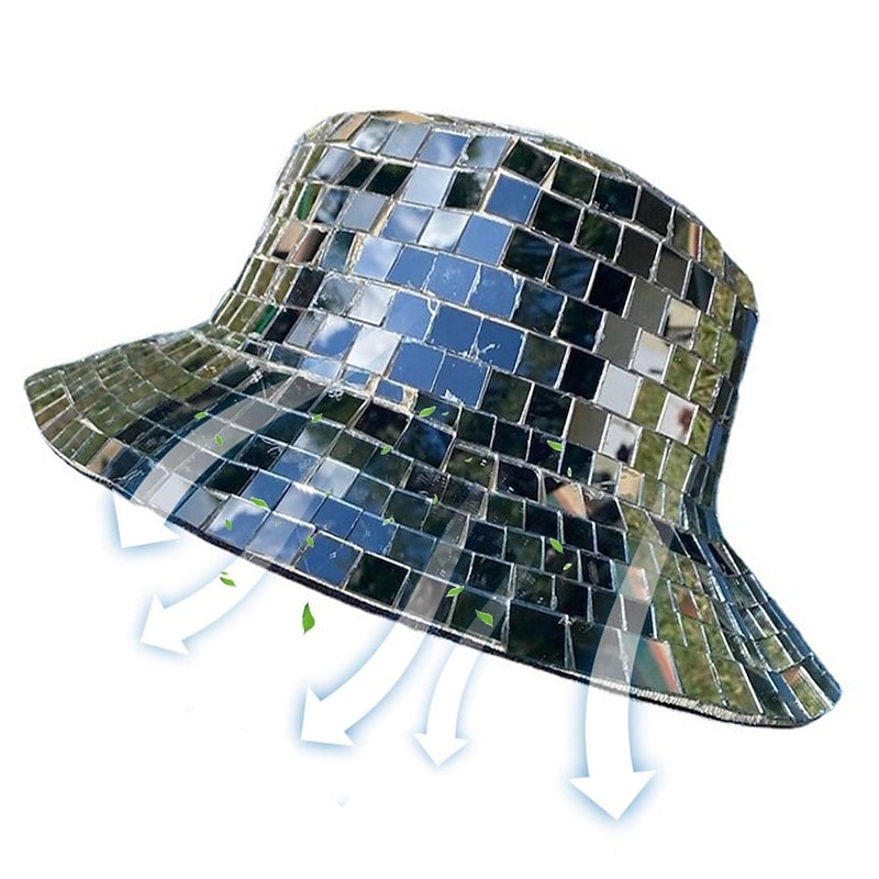 Highlights - Reliable Material: The 2023 Glitter Mirror Disco Bucket Hat is made of PVC + lenses, ensuring that it is soft, lightweight, durable, breathable, and provides sunblock protection. - Special Design: The internal washable padding and secure chin strap of this hat allow for a snug fit. It has been carefully designed and modified to incorporate mirror glass using only the highest quality materials. - Fine Handcraft: Our Trendy Fisherman Hats Disco Ball are handmade, which adds a unique touch to each hat. Minor imperfections and unique flaws may be present due to the handmade nature of the craft. - Reflective Disco Ball Hat: These Mirror Glitter Fisherman Caps create mesmerizing glow strokes when exposed to light. They are perfect for brightening up receptions, car shows, and bedrooms. - Perfect Party Decor: The 2023 Disco Crystal Bucket Hats, with their glass tile shine, add elegance to any scene. They can also be used as decorative additions for home, office, and wedding centerpieces.