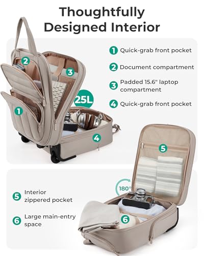 • Organized Storage: Effortless organization is achieved with ample storage, internal compartments, and a small zippered pocket for smaller items. The padded laptop compartment fits up to a 15.6-inch laptop. Making it an ideal carry-on for 2-3 day overnight trips.