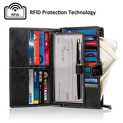 HOT ! Big Capacity Genuine Leather Wallet for Women RFID Blocking Zip Clutch with Phone Organizer Wristlet (Black)