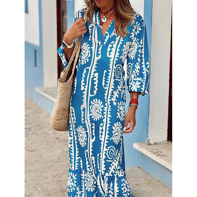 Women's Casual Dress Graphic Ruffle Print V Neck Long Dress Maxi Dress Ethnic Casual Daily Vacation 3/4 Length Sleeve Summer