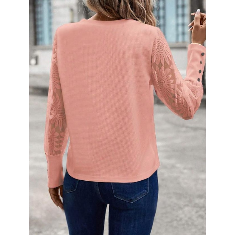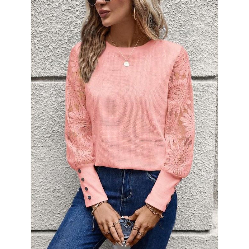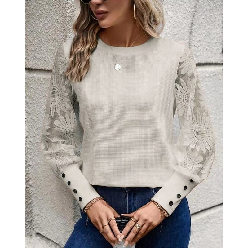 Highlights [Fabric] : Crafted from a high-quality polyester, this women's blouse ensures a comfortable and breathable fit, ideal for warm summer days. The fabric offers a gentle drape that complements the body's natural curves, enhancing the overall silhouette. [Fit] : The blouse features a relaxed fit with a classic crew neck, offering both comfort and elegance. Its versatile style is flattering on various body types, making it a staple piece for your wardrobe. [Design Highlights] : Highlighted by sheer lace sleeves adorned with intricate floral patterns, this blouse exudes elegance and femininity. The long sleeves are complemented by solid cuffs with stylish button details, adding a modern twist to the design. [Occasions] : Perfect for daily wear, this blouse can easily transition from casual outings to more formal events. Pair it with jeans for a relaxed look or with a skirt for an elegant touch, making it suitable for a variety of occasions. [Size Range] : Available in a range of sizes including S, M, L, and XL to accommodate diverse sizing needs.
