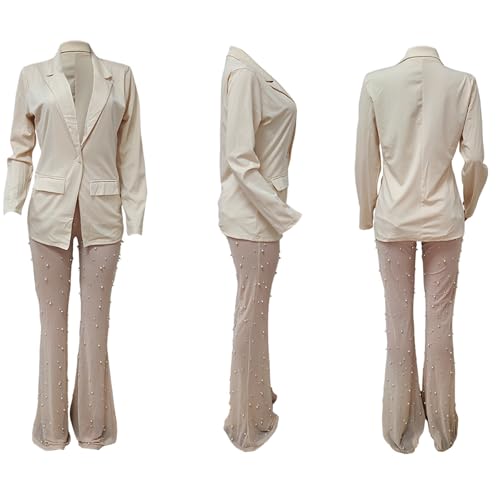 HOT ! LKOUS Sexy Blazer Suits for Women,Long Sleeve Blazer and Mesh Beading Pants Clubwear Set with Underwear