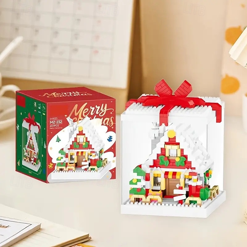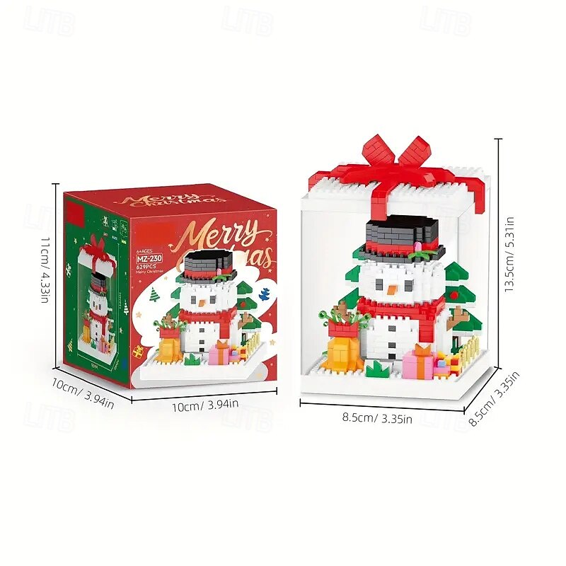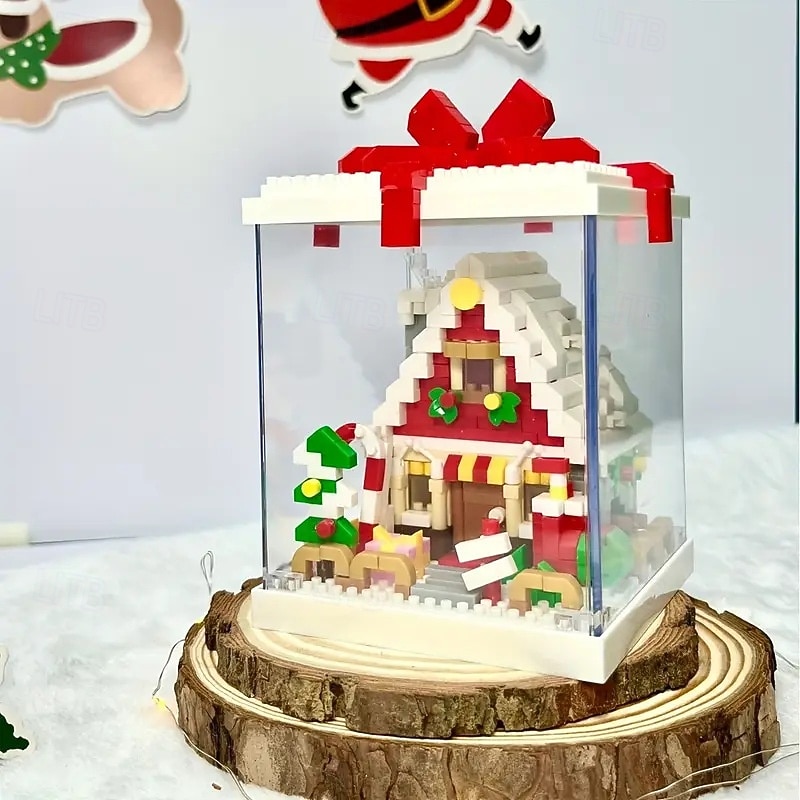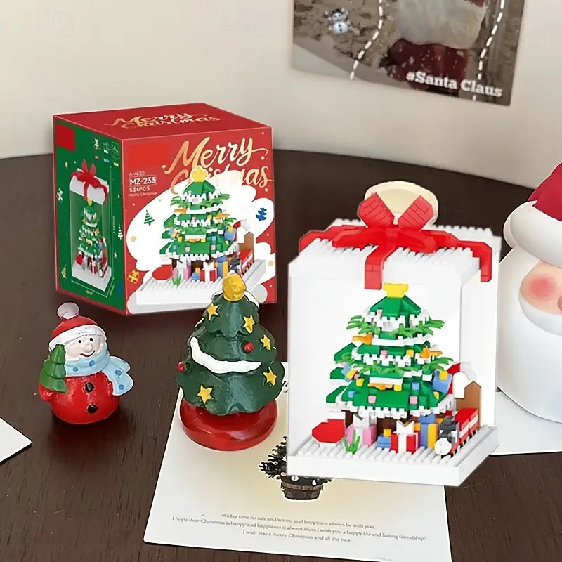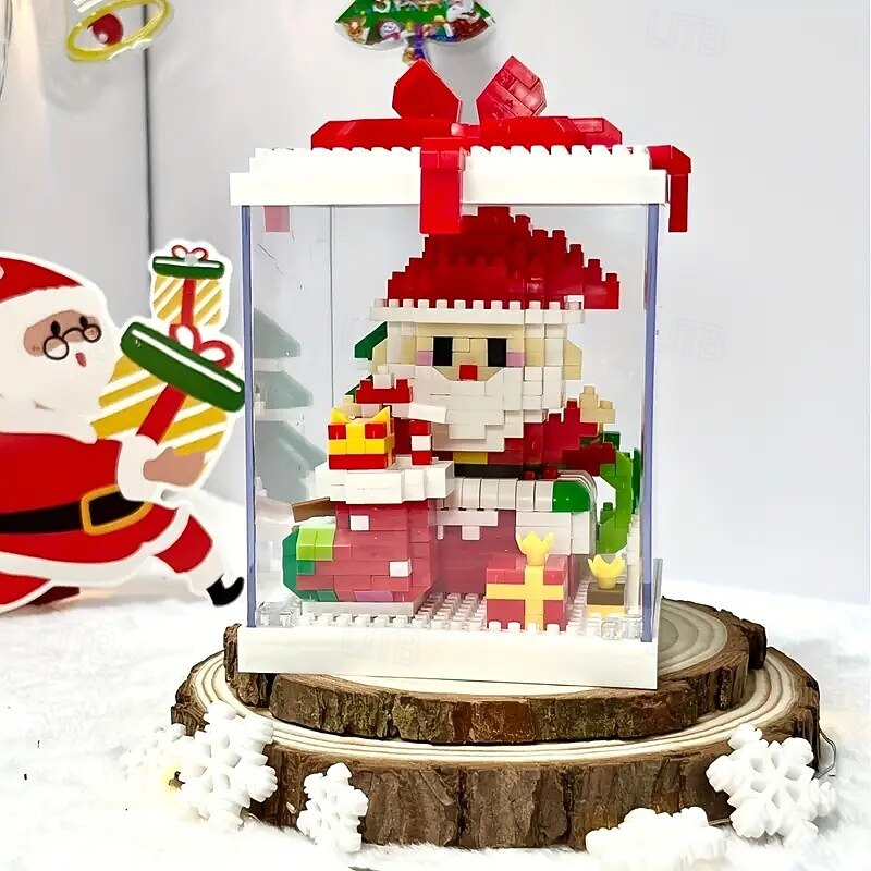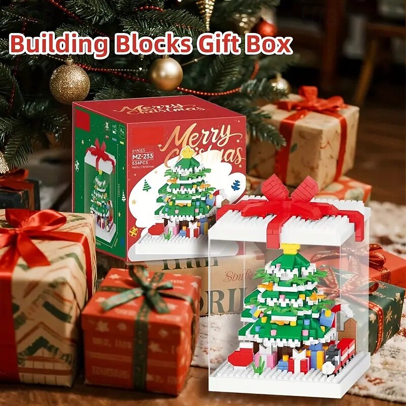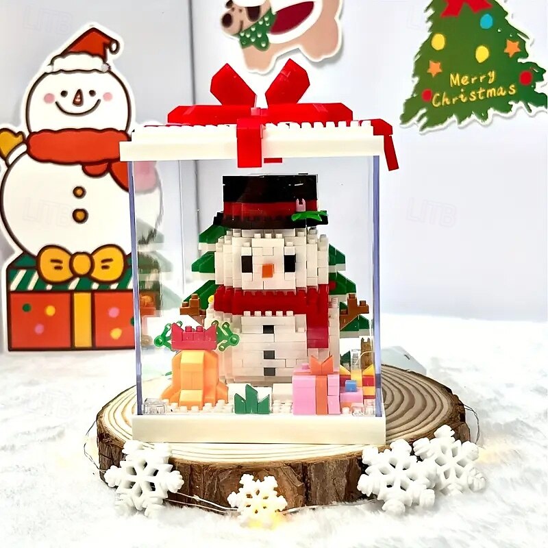 HOT ! Christmas Tree Building Block Gift Box Ornament with Presents, Mini Snowman, and Festive Decorations, Clear Display Case, Perfect Xmas Tabletop Décor and Gift Idea