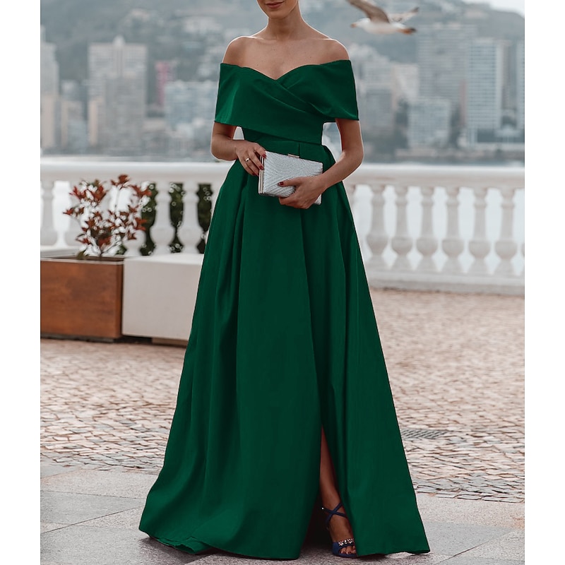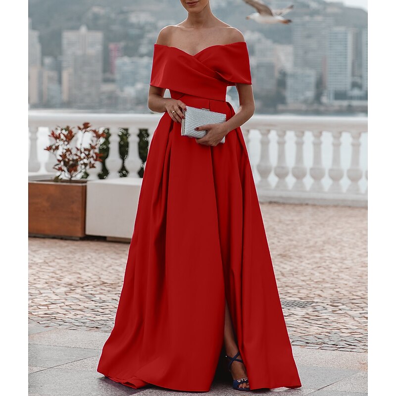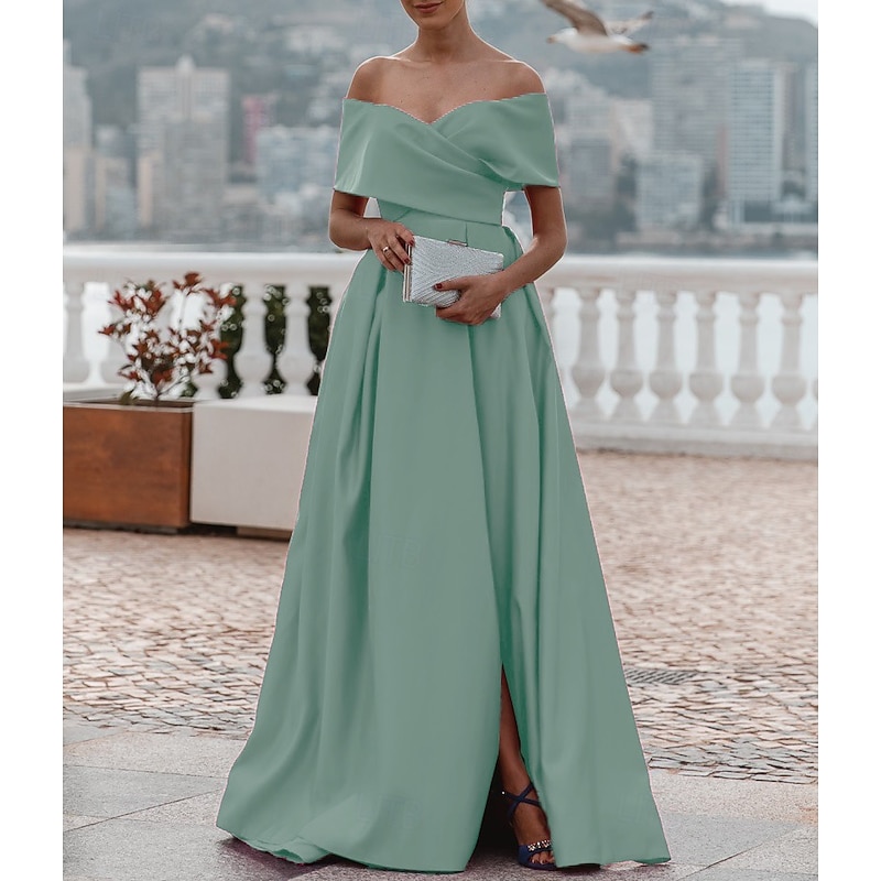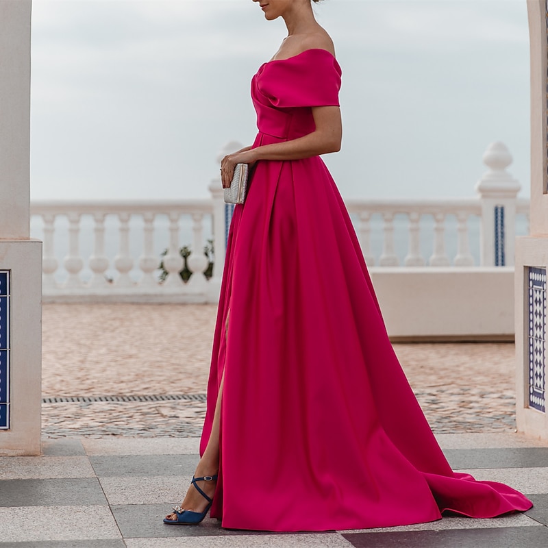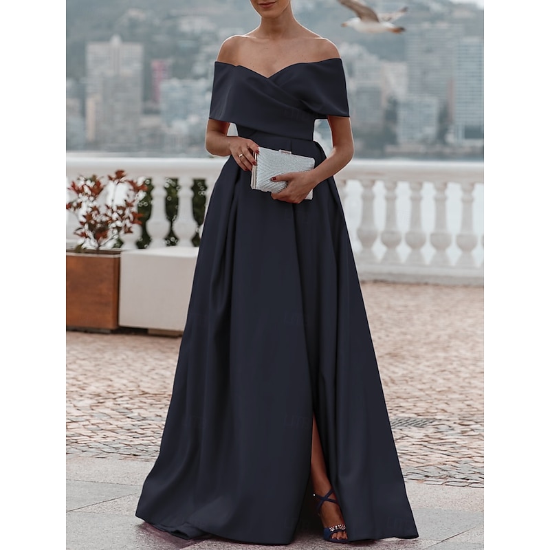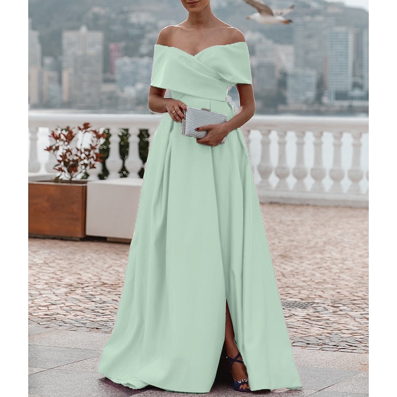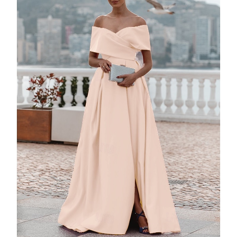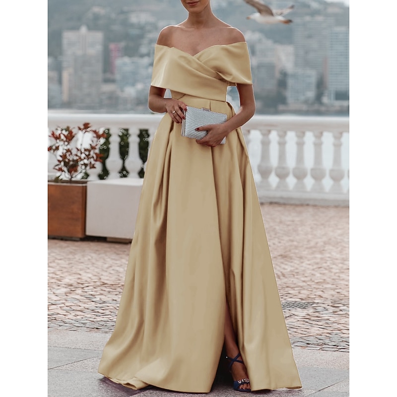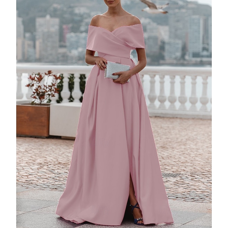 More information about A-Line Evening Gown Elegant Dress Formal Wedding Court Train Sleeveless Off Shoulder Bridesmaid Dress Satin with Ruched Slit