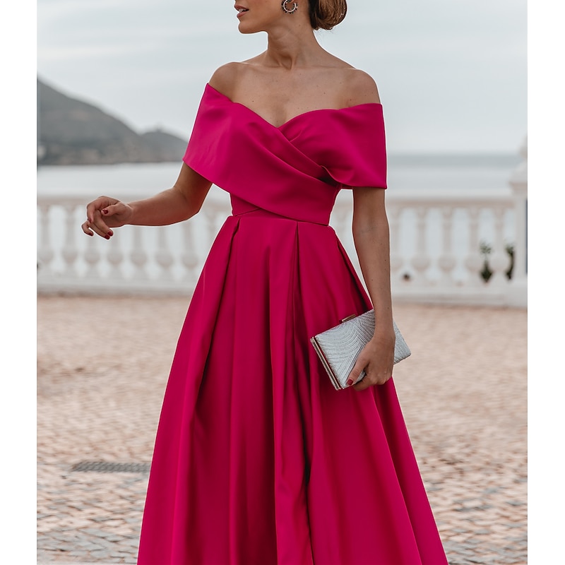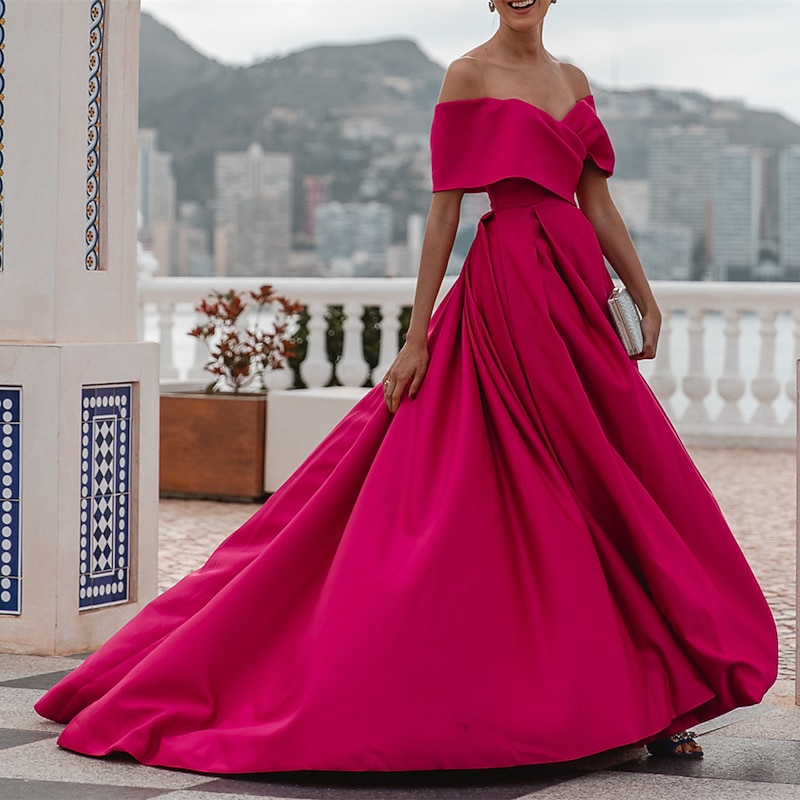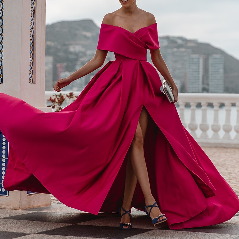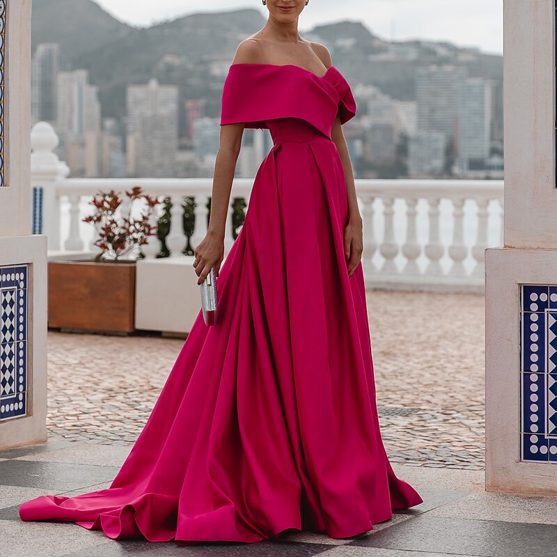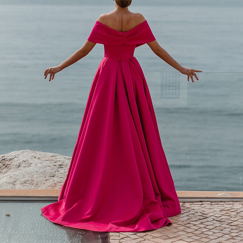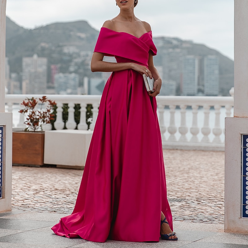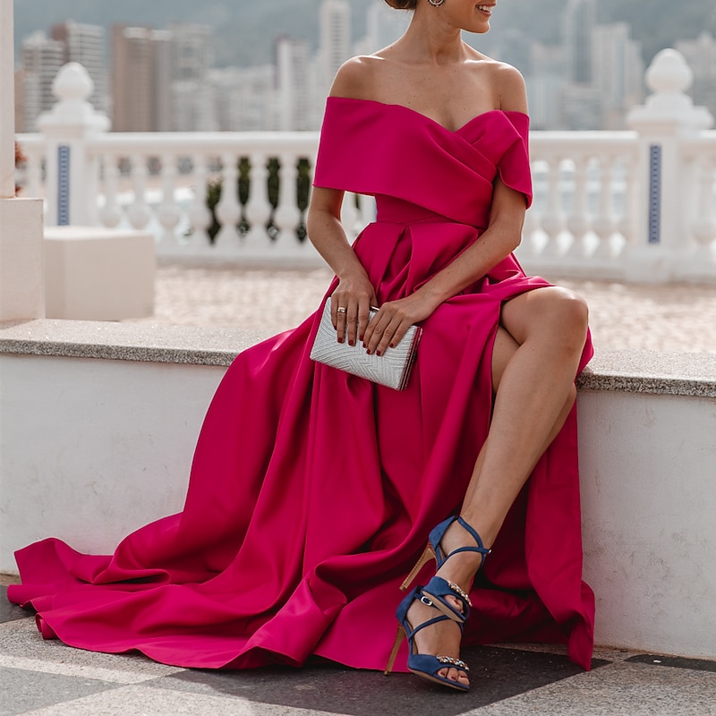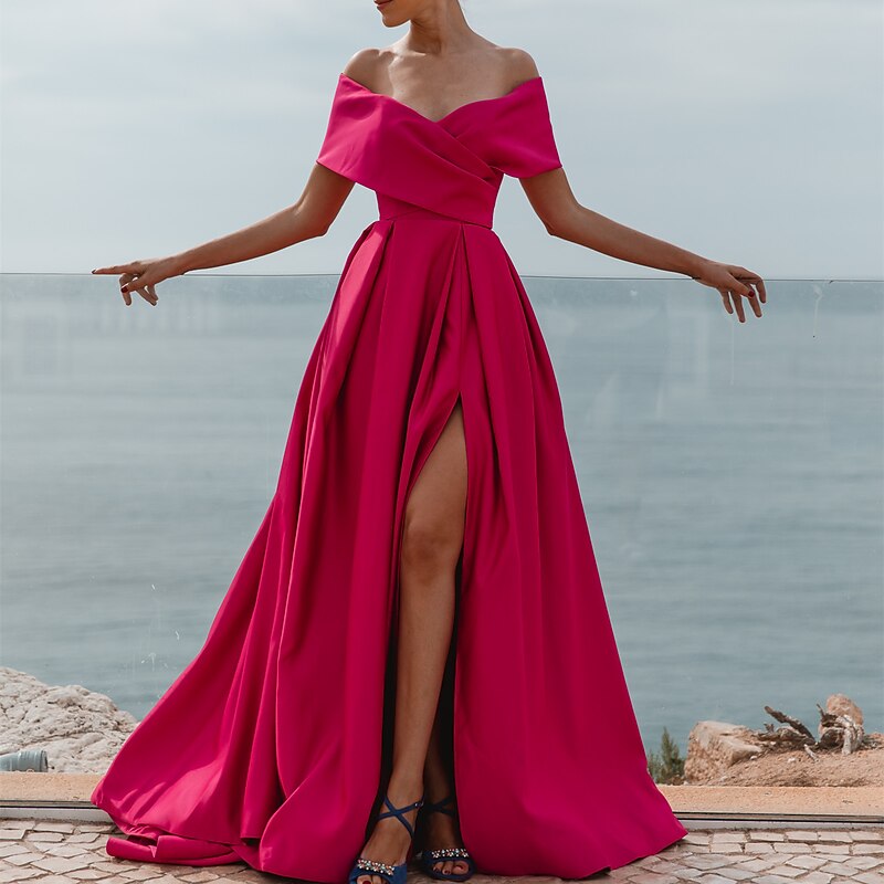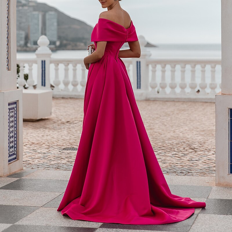 More information about A-Line Evening Gown Elegant Dress Formal Wedding Court Train Sleeveless Off Shoulder Bridesmaid Dress Satin with Ruched Slit