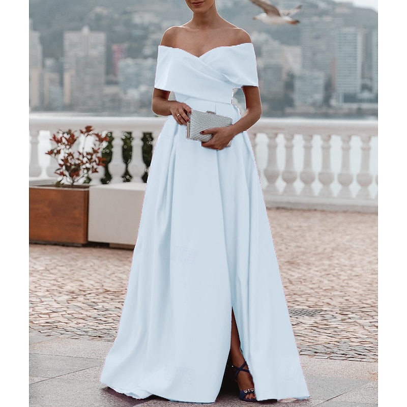 A-Line Evening Gown Elegant Dress Formal Wedding Court Train Sleeveless Off Shoulder Bridesmaid Dress Satin with Ruched Slit 1
