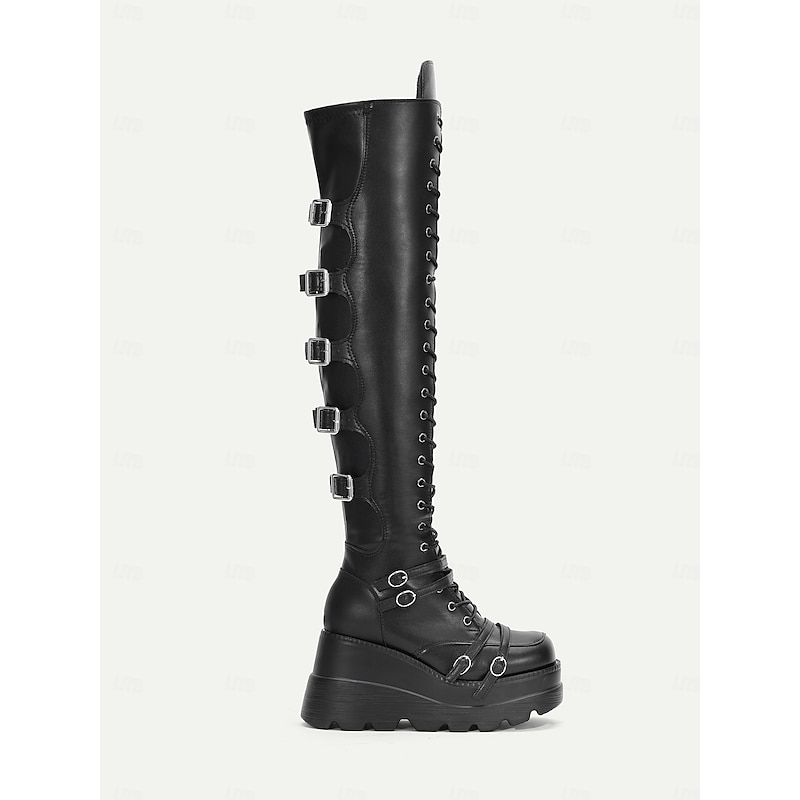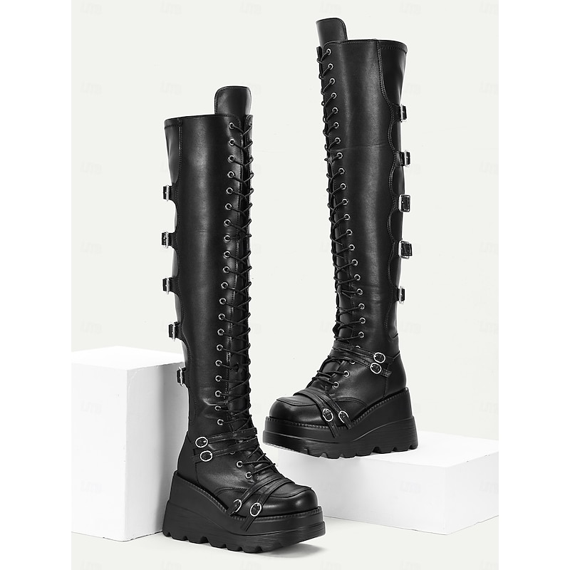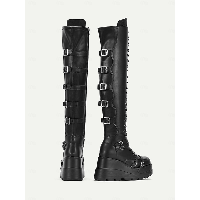 HOT ! Women's Black Over-the-Knee Platform Boots with Lace-Up Front and Buckle Straps, Faux Leather Gothic Punk Style, Ideal for Concerts, Parties and Streetwear Fashion