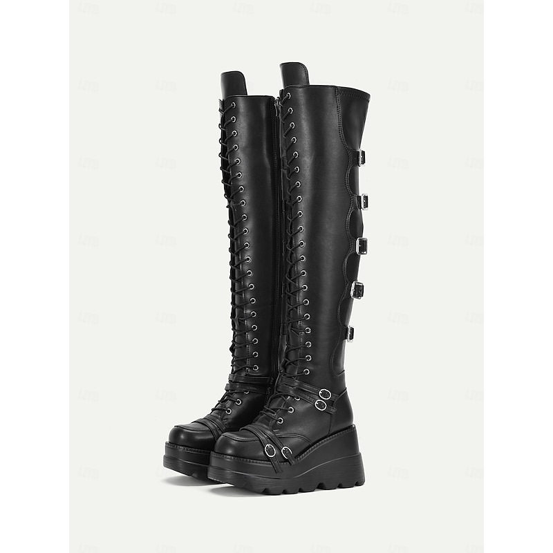 More information about Women's Black Over-the-Knee Platform Boots with Lace-Up Front and Buckle Straps, Faux Leather Gothic Punk Style, Ideal for Concerts, Parties and Streetwear Fashion