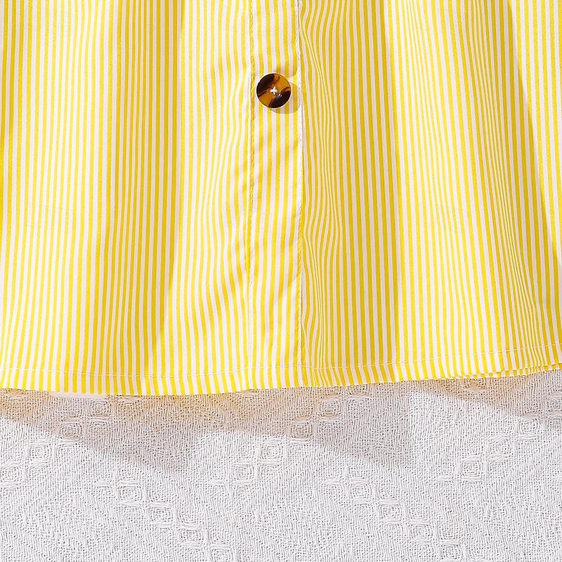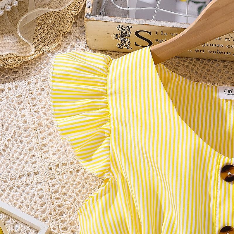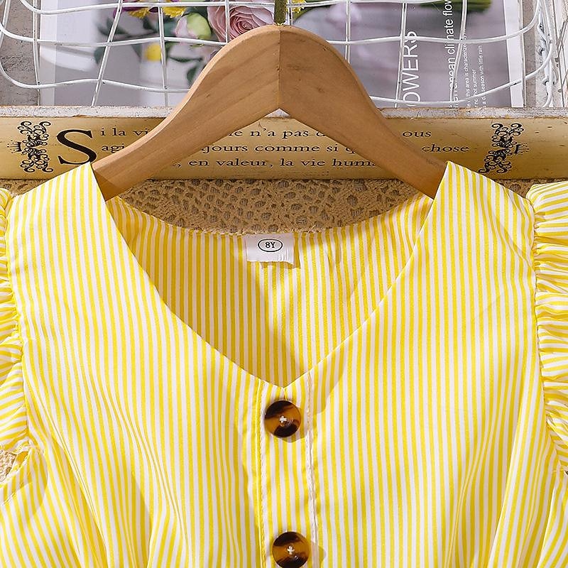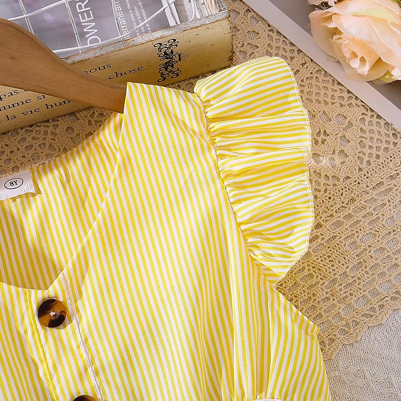 Highlights - Perfect for the summer season - Knee-length dress with a sweet style - Ideal for holiday and beach occasions - Designed for kids in a fun striped pattern - Features trendy ruffle detailing