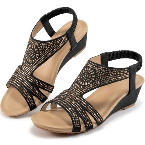 • Fashionable: Womens wedge sandals for beach are studded with sparkly rhinestone, the heel height is approximately 2.2 inches, which can be easily worn with pants and dresses. Open-toed wedge sandals for women keep you classy when you're out on dating, wedding, and party.