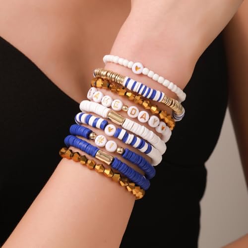 Material: Ploymer, AcrylicMetal type: Alloy SteelClasp type: BoloChain type: Bead ChainGem type: No gemstone【Game Day Bracelet】Finish off your game day outfits with our heishi bracelet set. Make a statement and celebrate your team's kickoff in style with these clay beaded stretch bracelet in your team colors, features football team colored disc clay beads, massage ‘GAME DAY’ and football charms, helmet charms and jersey charms strung on elastic bands. The perfect football accessories for sororities, college football games【Football Bracelets】Look fashionable and show your team spirit with our Game day heishi bracelets! Whether you're supporting your favorite national football team, cheering on your college football team, or showcasing your spirit for a football league, this football charm bracelet seamlessly blends into your game day ensemble. Its eye-catching design adds flair to any football outfits, the perfect game day accessories for any football players and football moms to show your passion【Game Day Stretch Bracelet】It’s football GAME DAY y'all!!! Score style points on game day with women's layering clay bracelets! Made of polymer clay disc beads, metal, rhinestone, which is stretchable, the comfortable fit ensures that it stays in place during even the most intense games. This beaded football bracelet is the perfect accessory to complete your sporty look. Add it to your cart now to show your support for your favourite team and get you fired up for the playoffs this season!【Football Mom Accessories】Make a statement and celebrate your team's kickoff in style with our football Game day bracelet set. Pair with a white top and denim shorts to show your team spirit! Whether you're heading to a game, practicing on the field, or just want to add sporty flair to your outfit, the twist headband is must-have. Perfect for game day to support your favorite team, choppin' in the stands or at home, sports meeting, high school football games, college games or any sports event【Game Day Outfits】Which team will you be rooting for? Get ready to stand out at tailgating events and football parties heishi bracelet. Embrace the spirit of the game, show off your team pride, and enjoy the camaraderie that comes with being a dedicated football moms. This sports bracelet also make a great gift for any football player, coach, football-loving friend or family member on super bowl Sunday, football games, backyard get together, birthdays or just because! Perfect for everyday use. superior materials and excellent craftsmanship ensure long-lasting durability.
