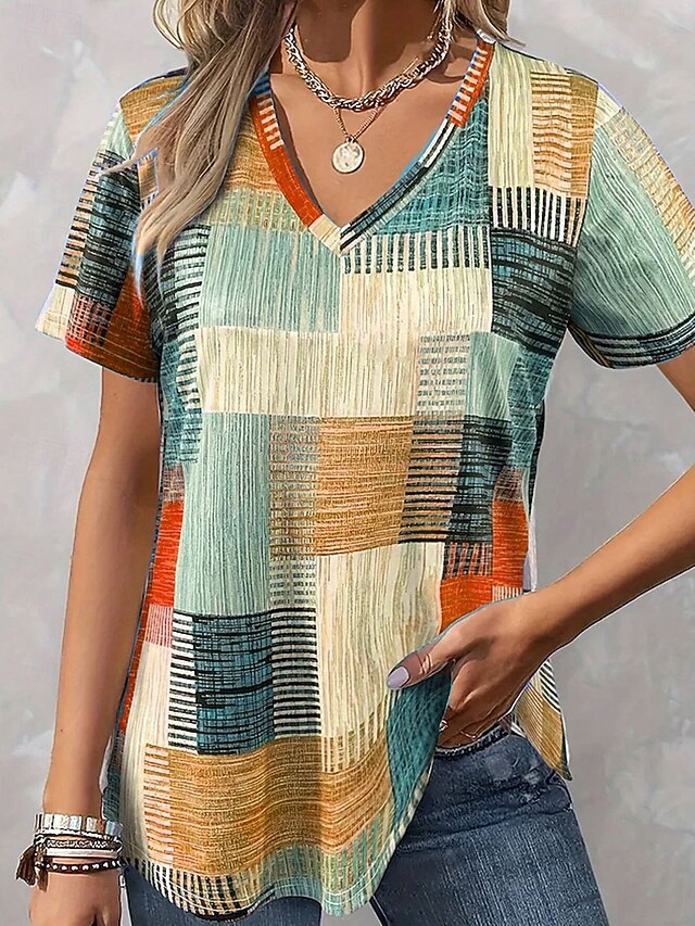Women's Blouse Graphic Geometric Casual Short Sleeve V Neck Regular Tops Daily Print Blue Purple Orange Green Summer Spring 9