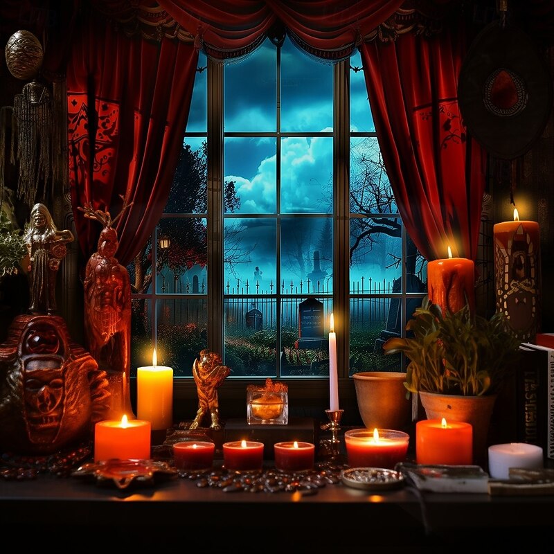 Halloween Gothic Window View Wall Tapestry – Red Curtain Stage with Spooky Moonlit Night Scene, Horror Backdrop for 2025 Halloween Living Room, Bedroom, Haunted House Decoration 11