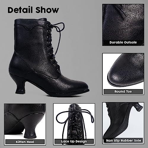HOT ! Women's Victorian Ankle Boots - Mid Calf, Round Toe, Black Boots with Chunky Heel & Lace Up Detail