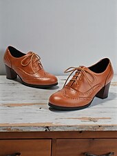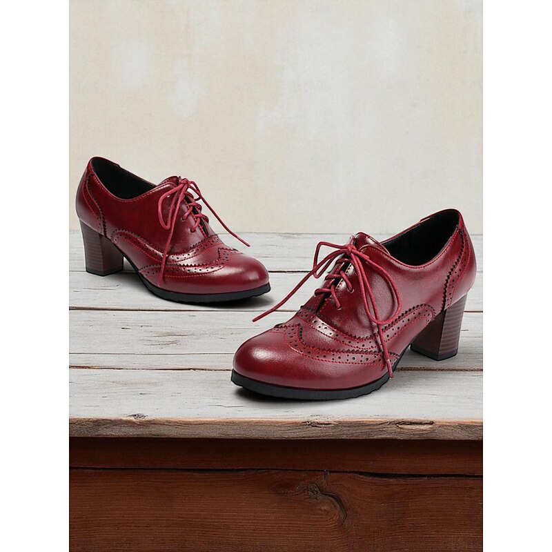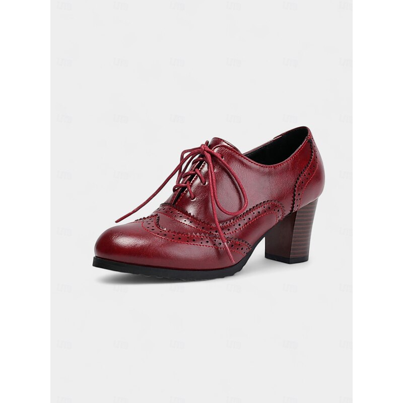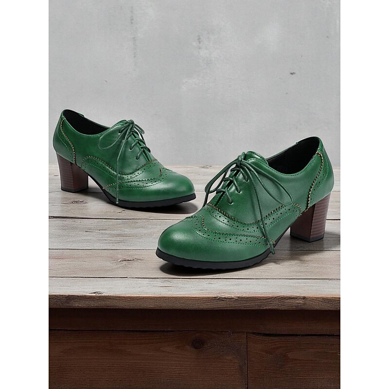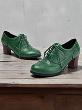 HOT ! Women's Green Faux Leather Oxford Heels – 1950s Vintage Brogue Lace-Up Chunky Heel Shoes for Work, Fall Fashion and Christmas Outfits