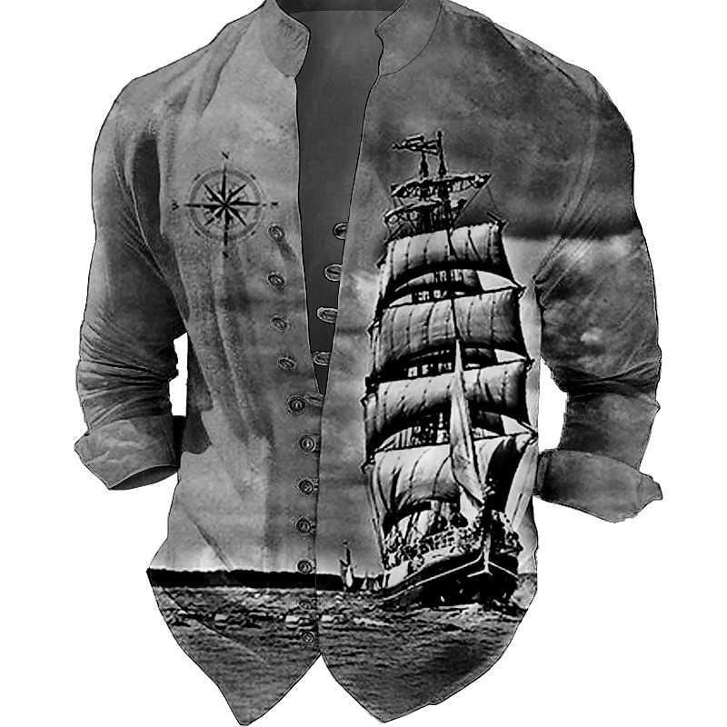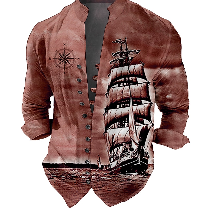 Highlights [Fabric]: This men's shirt is crafted from high-quality polyester, offering a lightweight and comfortable feel perfect for spring, summer, and fall. Its breathable fabric ensures easy wear throughout any day. [Fit]: Designed with a regular fit, this shirt offers both comfort and style, providing a modern silhouette that flatters the wearer's physique. [Design Highlights]: Featuring a vintage nautical theme, the shirt boasts a striking print of a sailing ship and compass rose, complemented by a stand collar and long sleeves. The button-front closure adds to its sophisticated and timeless appeal, making it a versatile piece for various occasions. [Occasions]: Ideal for daily wear, casual outings, or outdoor adventures, this shirt seamlessly blends retro and modern styles. Its adventurous design makes it perfect for themed events, bringing an element of history to any wardrobe. [Size Options]: Available in a range of sizes from S to 3XL, ensuring a comfortable fit for various body types. The color options—Blue, Brown, Green, Gray, Wine, and Blue-Green—offer classic and vibrant choices to suit individual preferences.