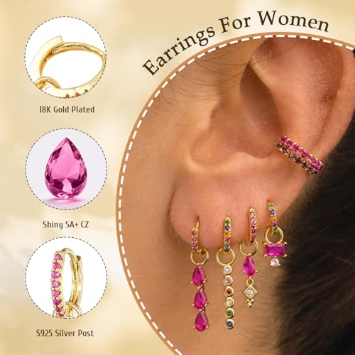 6pcs Gold Hoop Earring Stacks For Women Dainty Colorful Cubic Zirconia Huggie Earrings 18k Gold Hoop Earrings Cartilage Stud Earring Sets For Multiple Piercing 5