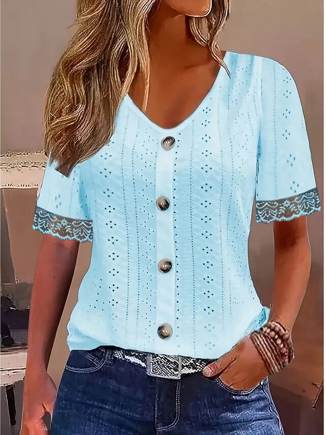 More information about Women's Lace Shirt Solid Color Stylish Casual Beach Short Sleeve V Neck Regular Tops Daily Lace Patchwork Buttons White Sky Blue Summer