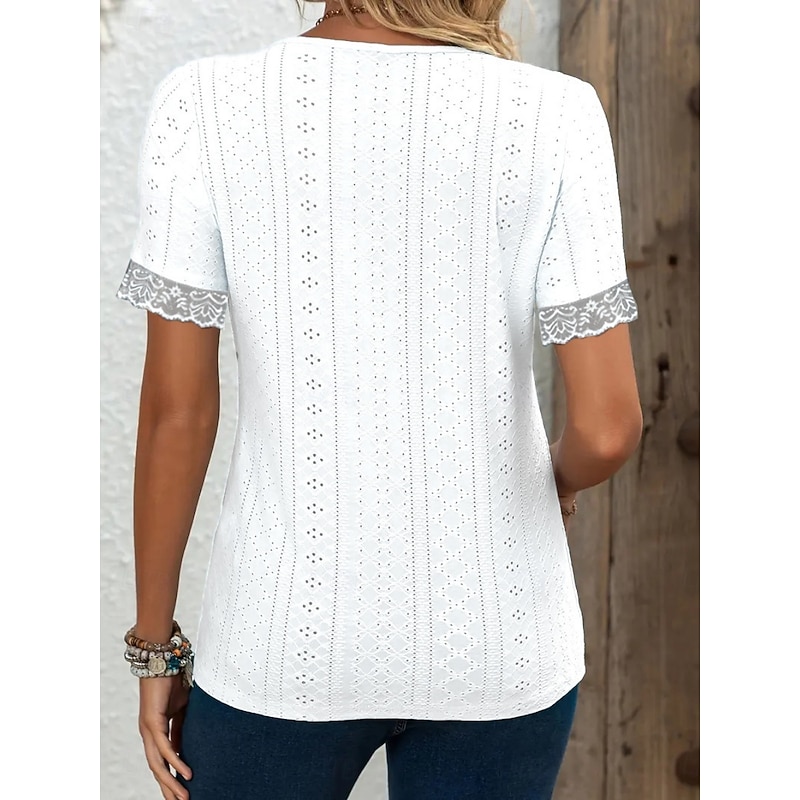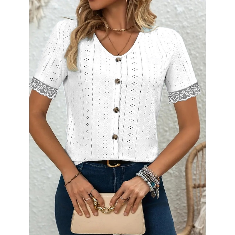 HOT ! Women's Lace Shirt Solid Color Stylish Casual Beach Short Sleeve V Neck Regular Tops Daily Lace Patchwork Buttons White Sky Blue Summer