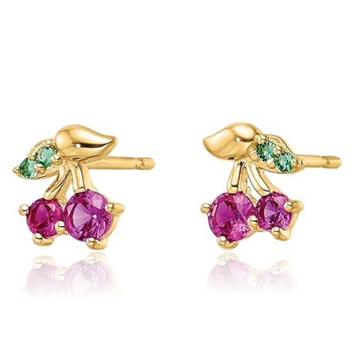More information about 14K Solid Yellow Gold Red Cubic Zirconia CZ Green Glass Cherry Stud Earrings