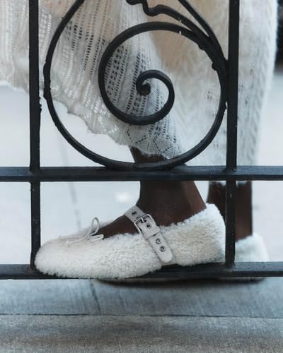 Women's Fur Ballet Flats with Bows Adjustable Strap Round Toe Slip On Flat Shoes Casual Buckle Leather Ballerina Winter Flats Fashion Cream Fur Mary Jane 5