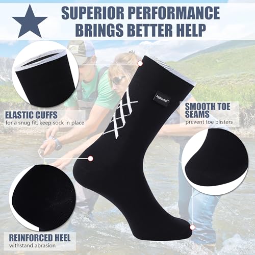 • 100% Waterproof: our waterproof socks are designed with three-layer knitting construction, which easily solves the problem between waterproofing and breathable. Coolmax fabric absorbs moisture and wicks sweat, keep your feet dry and comfortable! Just avoid submerging above the top.