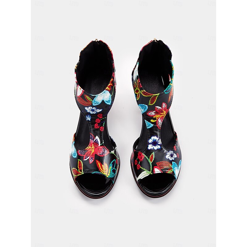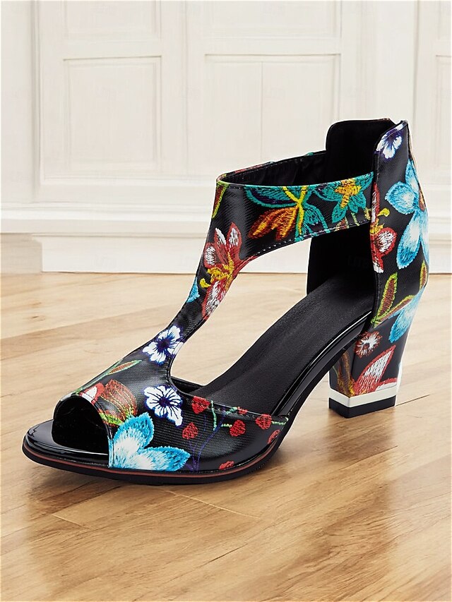 Highlights [Fabric] : Crafted from high-quality PU with a synthetic leather lining, these women's block heel sandals offer durability and comfort throughout all seasons. The glossy finish of the upper material adds an elegant shine, making these shoes an ideal choice for various occasions. [Fit] : These sandals feature a stylish block heel design, providing both height and stability. The open-toe style, combined with the pointed shape, ensures a fashionable look while maintaining comfort for extended wear. The cushioned insole is designed to support your feet, making these shoes perfect for all-day activities. [Design Highlights] : The vibrant floral print adorned with bold hues of red, blue, and green makes these sandals stand out. The cut-out T-strap design not only adds sophistication but also offers a secure fit. The zipper closure at the back ensures easy wear, complementing the chic look with a modern touch. [Occasions] : These colorful sandals are versatile enough to be worn for both casual outings and semi-formal events. Perfect for summer parties, daily wear, and adding a pop of color to your outfit, these sandals are designed to enhance your look effortlessly. [Size Notice] : Available in a range of sizes from US5.5 to US10.5, these sandals are true to size. For the best fit, select your usual size.