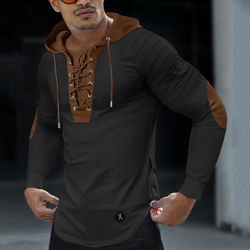 Men's T Shirt Tee Top Long Sleeve Shirt Long Sleeve Hooded Spring &  Fall Color Block Slim Pleated Fashion Designer Basic Lace up Patchwork Vacation Street Going out Black Green Khaki Top Tee for Men 1