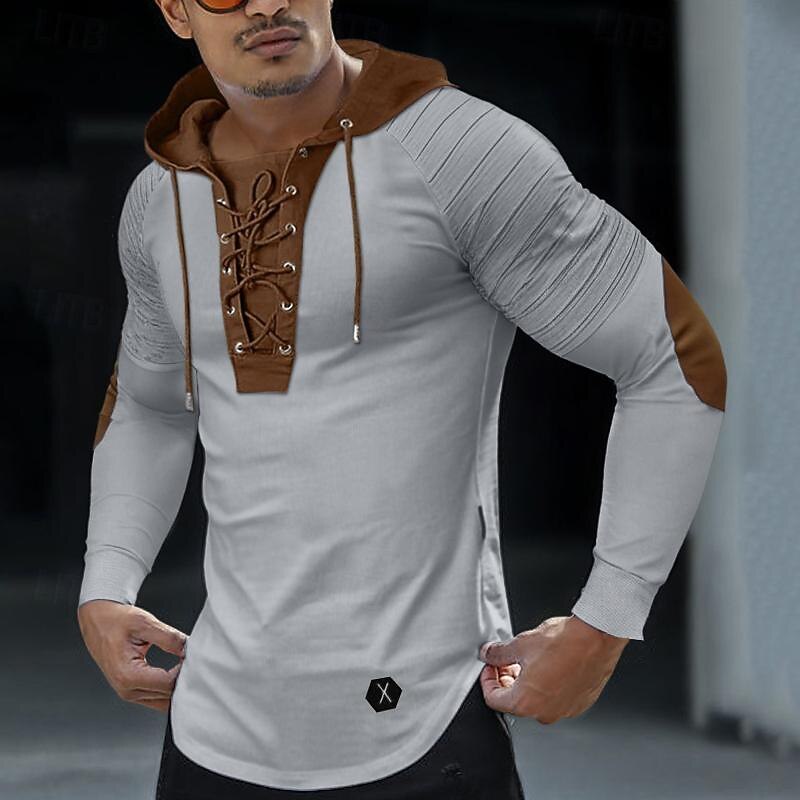 Men's T Shirt Tee Top Long Sleeve Shirt Long Sleeve Hooded Spring &  Fall Color Block Slim Pleated Fashion Designer Basic Lace up Patchwork Vacation Street Going out Black Green Khaki Top Tee for Men 13