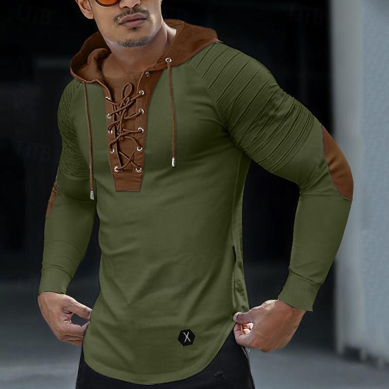 Men's T Shirt Tee Top Long Sleeve Shirt Long Sleeve Hooded Spring &  Fall Color Block Slim Pleated Fashion Designer Basic Lace up Patchwork Vacation Street Going out Black Green Khaki Top Tee for Men 12