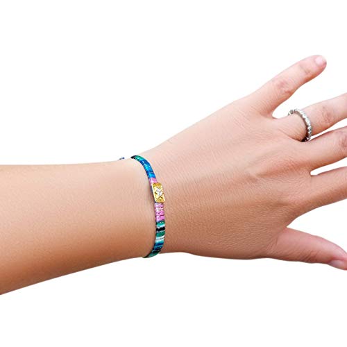 • Unique Handwoven Star of David Artwork: Each bracelet is meticulously handwoven with vibrant blue, white, gold, green, and pink hues, making it a truly personal and artistic Judaica piece.
