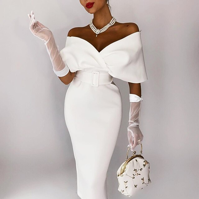 More information about Beach Wedding Sheath Cocktail Dresses Elegant Dress Wedding Guest Party Wear Tea Length Sleeveless Off Shoulder Stretch Fabric with Sash / Ribbon Masquerade Dress