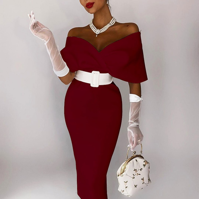 Highlights [Fabric & Fit] : Crafted from high-quality stretch fabric, this elegant off-shoulder dress provides a smooth and flattering sheath silhouette. Its built-in bra and boning ensure a secure and comfortable fit, accentuating the body's natural shape. [Design Highlights] : The dress features a timeless off-the-shoulder neckline with an elegant wrap style bodice. A chic sash or ribbon cinches the waist for enhanced definition, while the tea-length hemline adds a touch of sophistication suitable for various formal occasions. [Style & Occasion] : Perfect for cocktail parties, birthdays, the Kentucky Derby, and weddings, this dress embodies elegance and style ideal for graceful receptions and stylish gatherings. The sheath silhouette and modern design distinguish it as a versatile party wear choice. [Accessories & Complements] : The ensemble is beautifully enhanced with optional stylish sheer gloves and a vintage-inspired pearl necklace, adding a touch of classic charm to the overall look. Pair it with a chic handbag adorned with floral embroidery for additional elegance and flair. [Size Options] : Available in a wide range of sizes, from US 0 to US 26W, accommodating various body types. Custom measurements are also available to ensure a perfect fit for every customer.