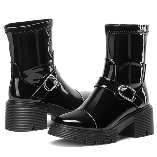 More information about Women's Mid Calf Boots Patent Round Toe Chunky Heel Platform Ankle Boots Trendy Slip on Moto Combat Booties