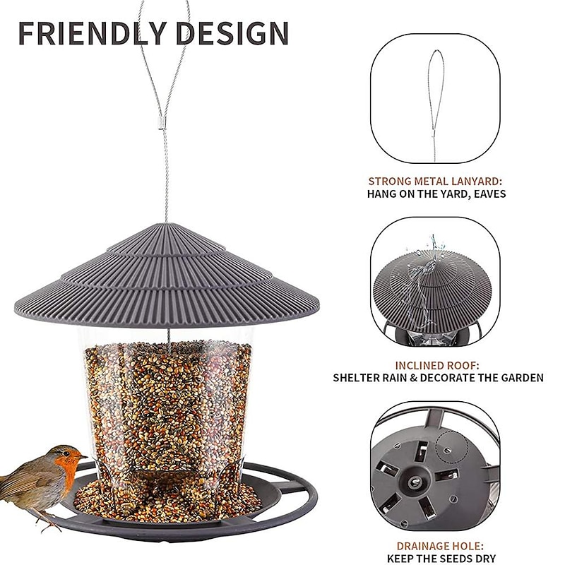 Highlights 1. Suitable for all sizes of grains: Our bird feeder house is designed to accommodate both large and small grains, allowing birds to easily access their favorite food such as broken peanuts and sunflower seeds. This ensures their comfort and happiness while feeding. 2. Ample food capacity: Our bird feeder features a generously sized feeding tank, making it easy to fill with a large quantity of grains. The feed effortlessly glides down without any manual lifting required, saving you time and effort. 3. Protection against the elements: The sloping roof of our hanging bird feeder provides excellent sun and rain protection for birds, ensuring that the grains remain dry at all times. This is crucial for their optimal nutrition and enjoyment. 4. Convenient and ready to use: Our wild bird feeder comes ready assembled and is easy to hang wherever you desire. It is made from high-quality PC + ABS material, which is not only durable but also waterproof and easy to clean for long-lasting use.
