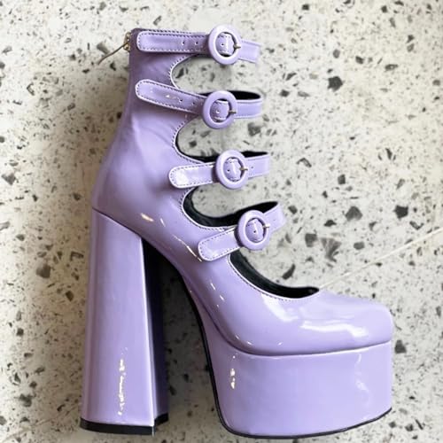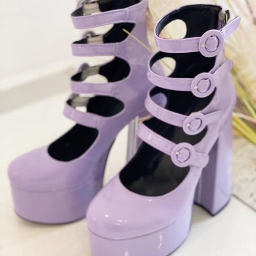 More information about Frankie Hsu Lolita Women's Large Size Buckle Strap Plain Purple Violet Patent Leather Platform Chunky High Heels Ankle Heeled Sandal Boots Shoes