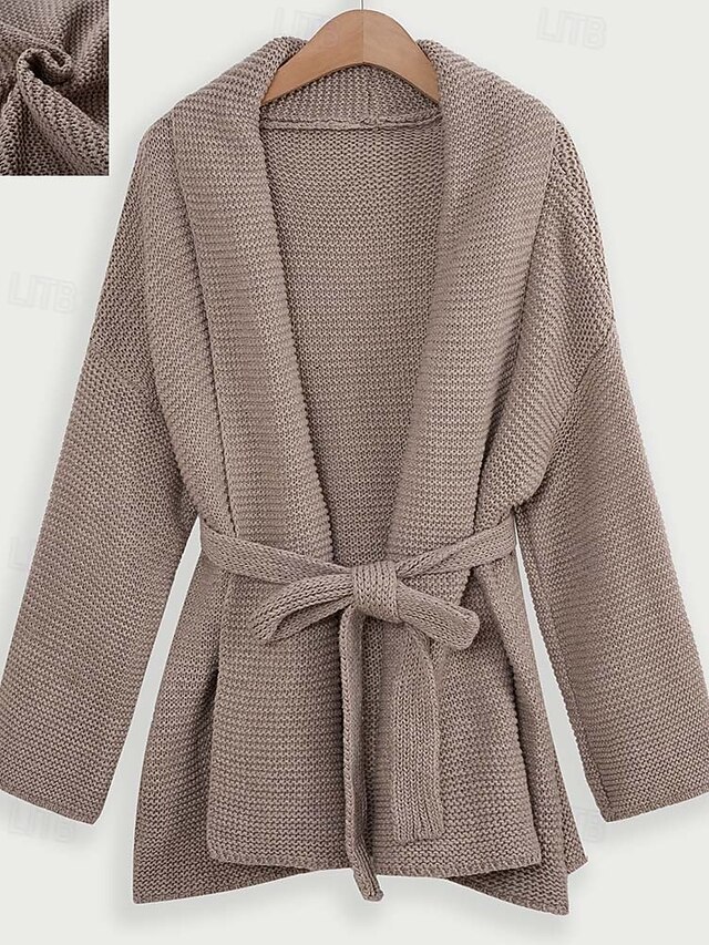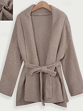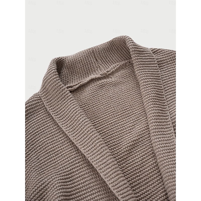 Highlights [Fabric] : Crafted from soft, high-quality wool, this women's cardigan offers both warmth and comfort. The micro-elastic material ensures a comfortable fit, making it an essential piece for fall and winter wear. [Fit] : Featuring a regular fit, this long-sleeve cardigan is designed with an open front, providing a relaxed look. The included matching belt allows you to cinch the waist for a more defined silhouette. [Design Highlights] : The textured knit pattern adds a cozy and visually appealing element, while the elegant shawl collar elevates the overall style. The open-front neckline allows for easy layering over any outfit. [Occasions] : Perfect for outdoor activities, streetwear, or daily wear during cooler seasons. This versatile cardigan effortlessly combines comfort and style, making it suitable for a wide range of casual outings. [Size Range] : Available in a one-size-fits-most design, accommodating different body types with ease and flexibility. Available in classic solid colors, including Black and Khaki, to match various style preferences.