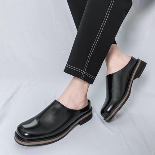 HOT ! Mens Retro Patent Leather Backless Slip-On Chunky Heels Loafers Casual Round Toe Non-Slip Shoes for Walking Business Party Wedding