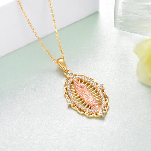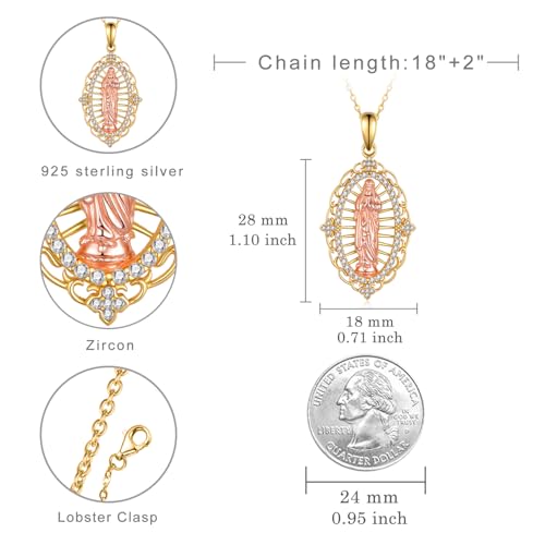 Material: Sterling SilverMetal type: Sterling SilverClasp type: LobsterChain type: CableGem type: ZirconCatholic Jewelry Design: Embrace divine elegance with this delicate catholic necklace for women. Wearing it serves as a constant reminder of your dedication to the teachings of Christ and the intercession of the Blessed Virgin Mary, making it a meaningful accessory for devout Catholics.Material: Made of 925 sterling silver, plated with rose gold and 10k yellow gold. Nickel free, lead free, hypoallergenic and highly polished. Whether you're dressing up for a special occasion or going for a casual look, this Mother Mary necklace adds a touch of faith and style to your ensemble.Catholic Pendant Size: height 28 mm, width 18 mm, the chain length can be adjusted freely. Featuring a Virgin Mary Medal in an intricate hollowed-out design and 56 white cubic zirconia stones. plush to wear for a long time, suitable for most women and young ladies as a fashion daily item.Catholic Jewelry for Women: This virgen de guadalupe necklace is not only a fashion accessory, but also a carrier for conveying good wishes. Our Virgin Mary pendant comes with an brand gift box, is a great gift choice for women, mom, wife, family or friend for birthday, anniversary, Mother's Day, Christmas and Thanksgiving.Satisfaction Service: We are committed to providing the best customer support and high-quality jewelry. If you like the Virgin Mary necklace for women, you can share the product with more people. Having any issue, please feel free to contact us for you to solve. Perfect for everyday use. premium materials and excellent craftsmanship ensure long-lasting durability.