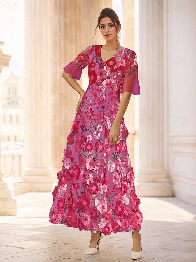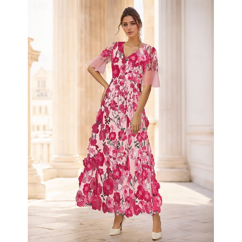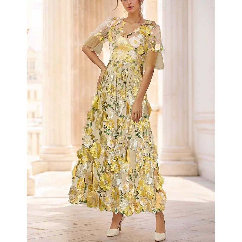 More information about A-Line Cocktail Dresses Gown Formal Wedding Guest Floral Elegant Ankle Length Short Sleeve Illusion Neck Tulle with Embroidery Appliques
