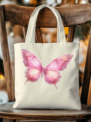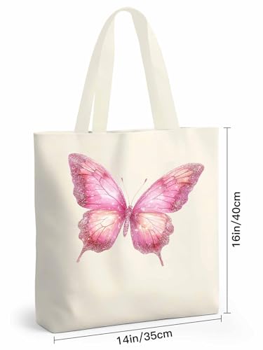 HOT ! Canvas Tote Bag Fantasy Pink Butterfly Reusable Grocery Shopping Bag,Shoulder Tote Bags for Women Vacation Travel Work Gym