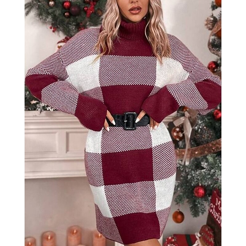 Women's Sweater Pullover Fashion Casual Checkered Ribbed Turtleneck Knitted Long Sleeve Long Tops Knit Christmas Outdoor Daily Red Fall Winter 2