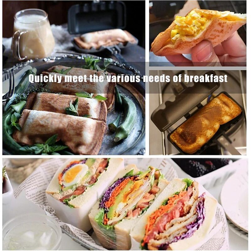 Highlights - Versatile Use: This non-stick sandwich frying pan is perfect for sandwiches, pancakes, omelets, frittatas, and toast, making it a kitchen essential. - Efficient Functionality: Seamless design for even heat distribution and reduced oil consumption, ideal for creating delicious breakfasts with high heat transfer efficiency. - User-Friendly: The detachable heat-resistant handle provides a comfortable grip, with a hanging hook and buckle for convenient storage, saving valuable kitchen space. - Durable Material: Crafted from premium aluminum alloy, our hot sandwich maker is highly durable, heat-resistant, and easy to clean—simply wipe or brush off after use. - Comfortable Handling: The handle remains cool to the touch during cooking sessions, ensuring ease of use, with a hook design for easy storage and optimized kitchen space.