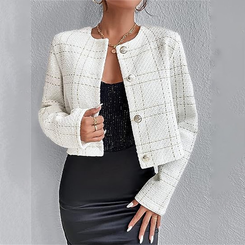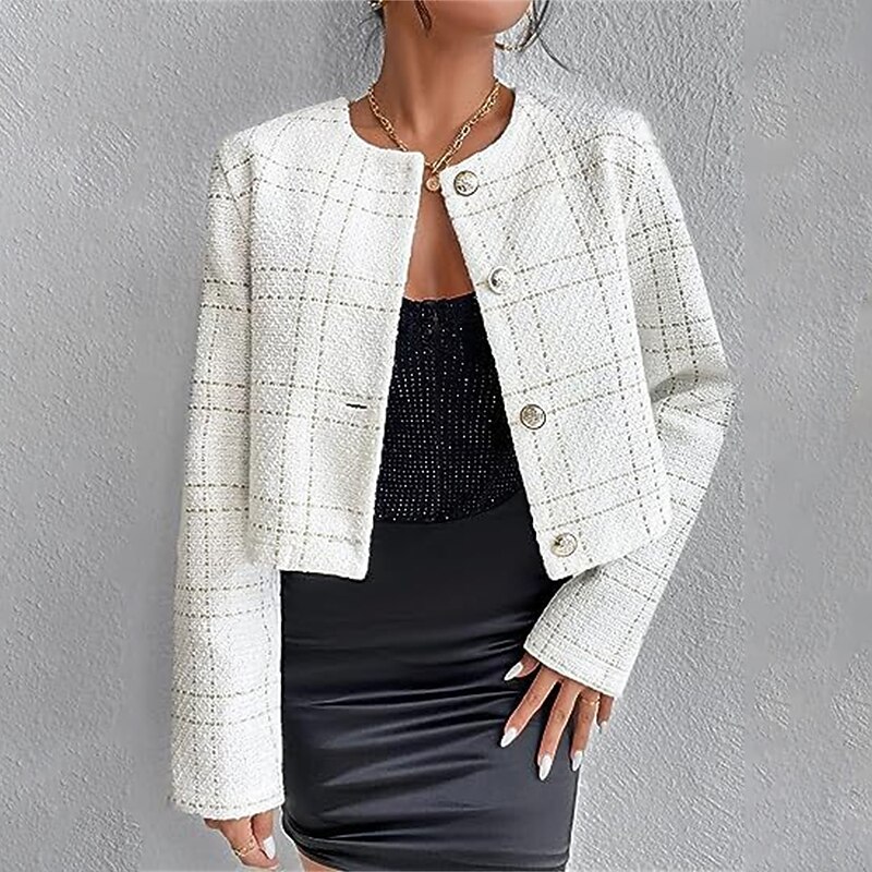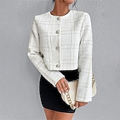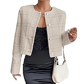 Highlights [Fabric] : This women's casual jacket is crafted from high-quality polyester, ensuring durability and a soft-to-the-touch texture. The material is specifically chosen for its windproof and warm properties, making it perfect for fall and winter wear. [Fit] : Designed with a regular fit, this jacket offers a balance of comfort and style. The cropped silhouette and structured tailoring create a polished look, allowing for versatile styling with various outfits. [Design Highlights] : Featuring a monochromatic plaid pattern with subtle dark lines, this jacket exudes timeless elegance. The crewneck and long sleeves provide a classic touch while enhancing comfort and functionality. The front is adorned with single-breasted metallic buttons and practical pockets, combining style with utility. [Occasions] : Ideal for daily wear, street style outings, vacations, and sporting events. This versatile jacket can be dressed up for the office or styled casually for a relaxed day out, making it a staple in any wardrobe for the colder seasons. [Size Range] : Available in a wide range of sizes from S to XXL, ensuring a comfortable fit for various body types. This diverse sizing makes it suitable for different preferences and styling needs.