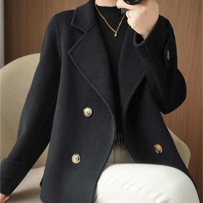 Women's Winter Blazer Coat Fall Double Breasted Lapel Jacket Wool Blend Short Coat with Pockets Warm Black White Camel 7