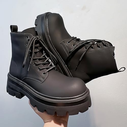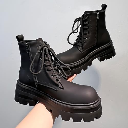 Men's Black Leather Platform Lace-Up Ankle Boots Fashion Round Toe Side Zipper High Top Boots Comfort Non Slip Streetwear Booties 6
