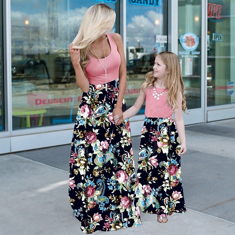 Mommy and Me Dresses Floral Street Patchwork Light Pink Black-1 Black-3 Sleeveless Maxi Tank Dress Active Matching Outfits 6