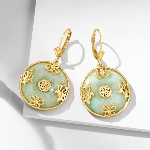 • JADE + 18KT GOLD OVER STERLING — Jade "Good Fortune" butterfly drop earrings in 18kt yellow gold over sterling silver. 20mm round carved jade. Polished finish. 1 3/8 in. hanging length. Lever backings.