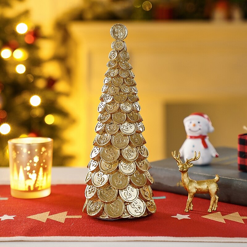 HOT ! Christmas Tabletop Tree Decoration, Golden Acorn Pinecone Dollar Bitcoin Design, Resin Mini Christmas Tree Statue Ornament for Holiday Indoor Décor, Shop Window Display, Gift